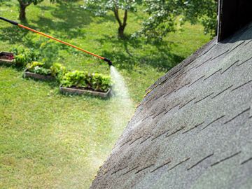 Removing black streaks, moss, algae, and lichen from roofs. This is typically done with a soft wash method to avoid damaging shingles.